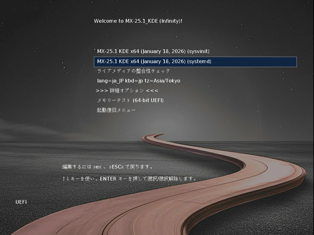 使用言語(lang=ja_JP)、キーボード(kbd=jp)、タイムゾーン(tz=Asia/Tokyo)を設定後、MX Linux を起動します。